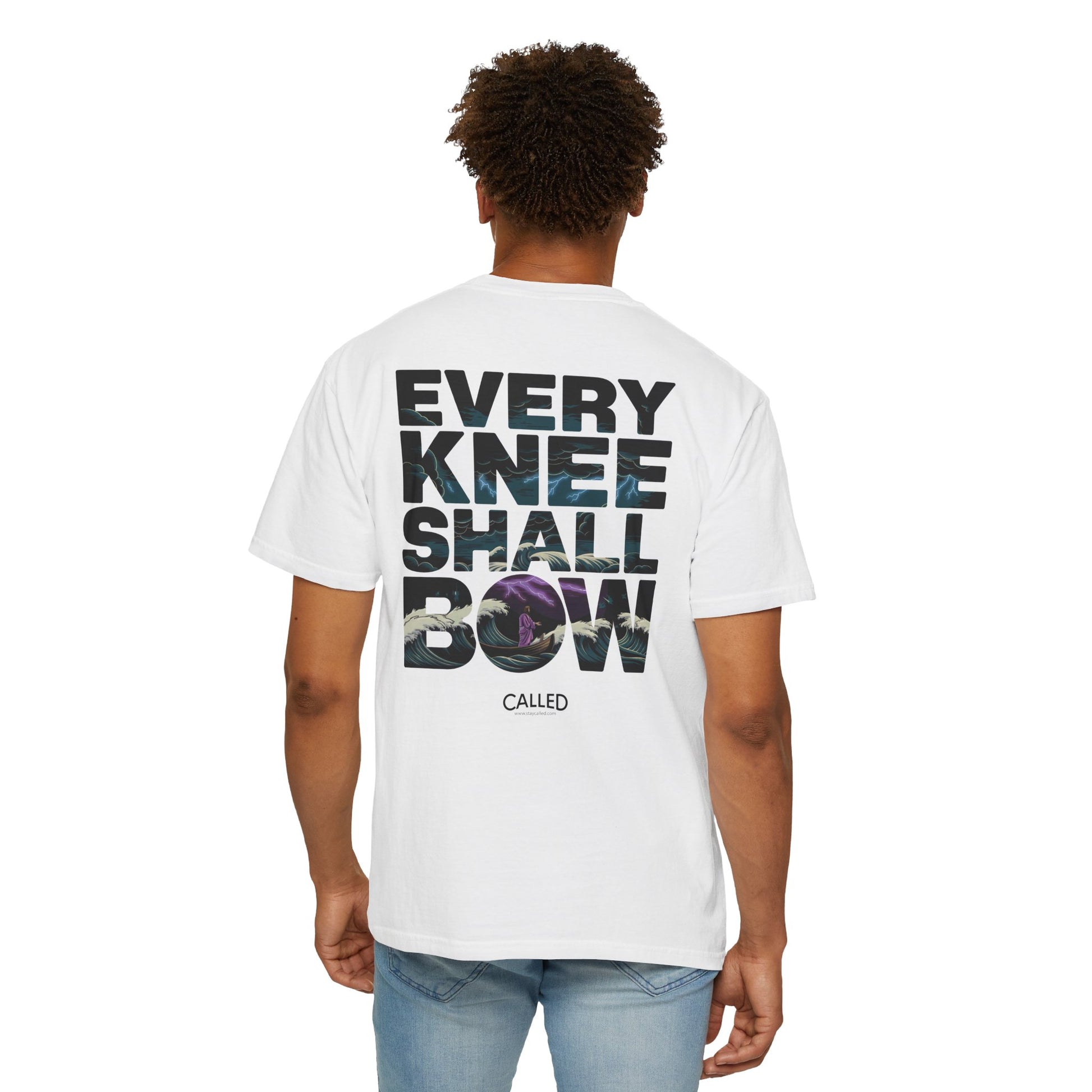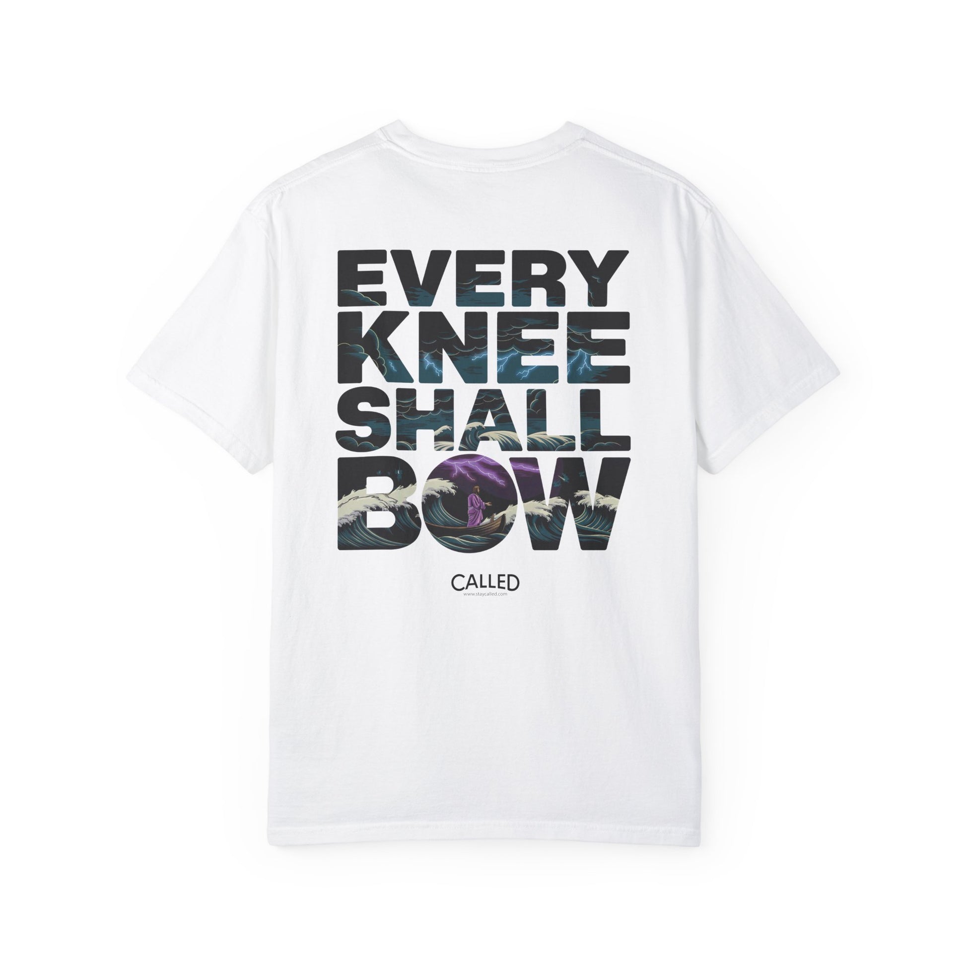 Inspired by Philippians 2:10-11. This design echoes the scripture: "At the name of Jesus every knee should bow, in heaven and on earth and under the earth, and every tongue acknowledge that Jesus Christ is Lord, to the glory of God the Father." Let this shirt boldly proclaim the universal sovereignty of Jesus Christ, inviting all to recognize His majesty and bow before Him in reverence and worship.
